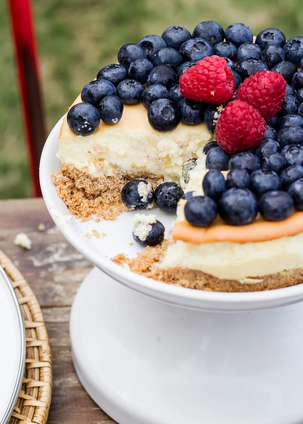 With SO many place settings, glasses and things, cake stands are a great way to elevate items, like this tasty cheesecake. To dress it up All-American Style, I topped it with blueberries and raspberries. Since this was a smaller cheesecake, I improvised and used the Rhodes Drink Dispenser Stand from Pottery Barn.