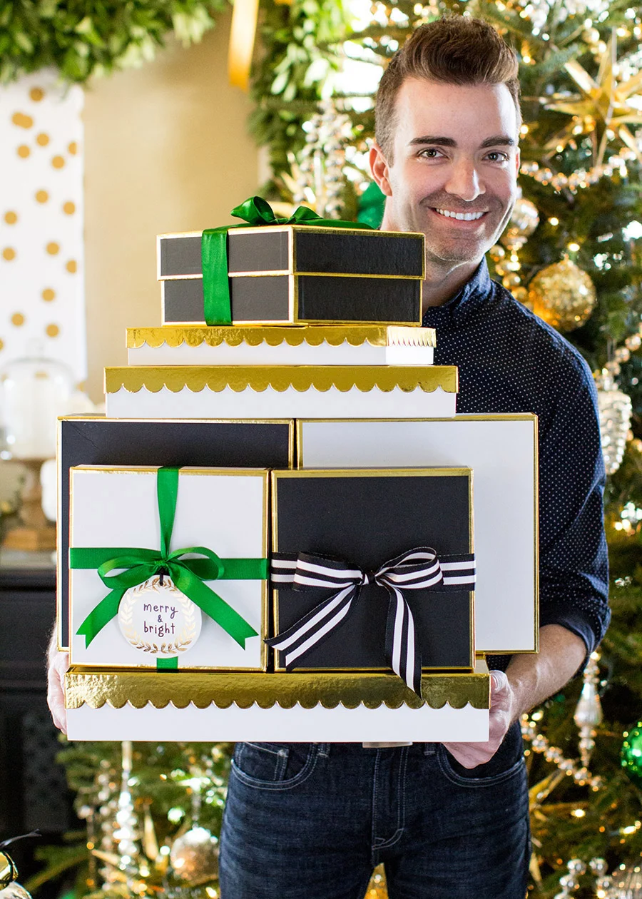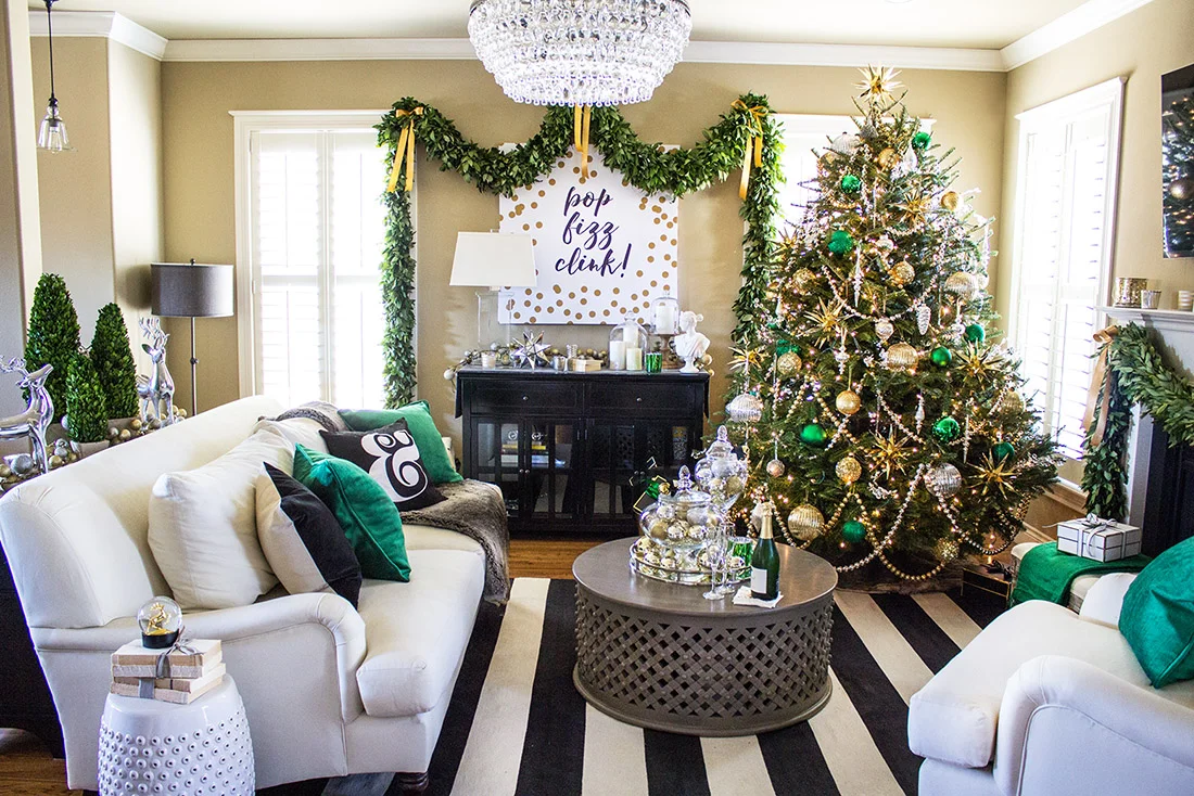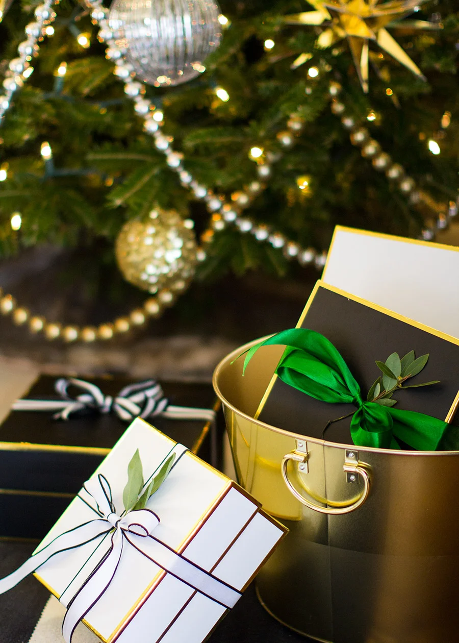 This year's vision was born out of my love for emerald green and gold with a little touch of Kate Spade. I had already purchased the KS ampersand pillow to go with my black and white striped Olin rug from Crate and Barrel. When I found the gift boxes and wrap from Sugar Paper LA, I knew what I wanted to do. Luckily I had PLENTY of silver from last year but the problem? I didn't own any gold or green Christmas ornaments, whatsoever!