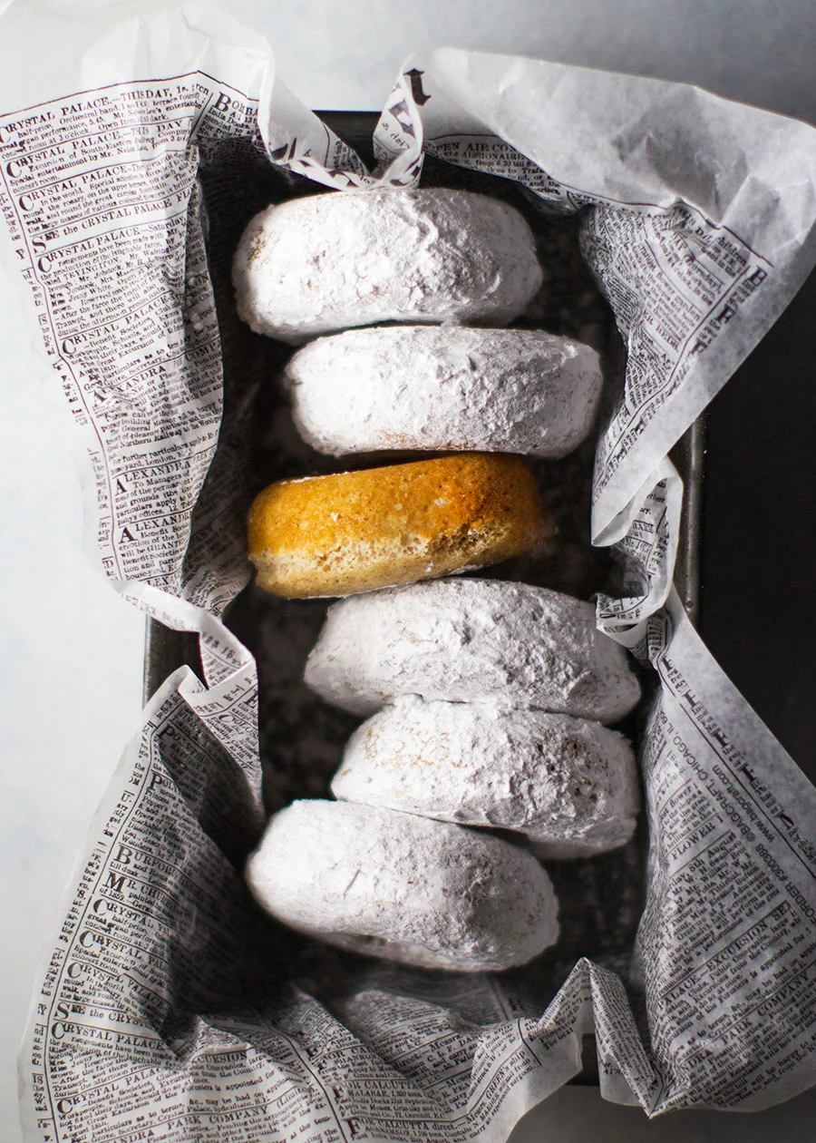 - In a pie dish, dredge each donut in powdered sugar until completely coated.