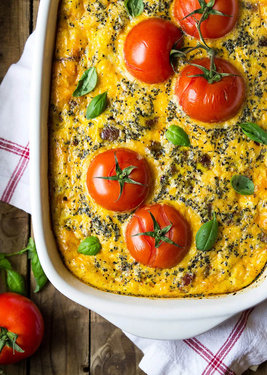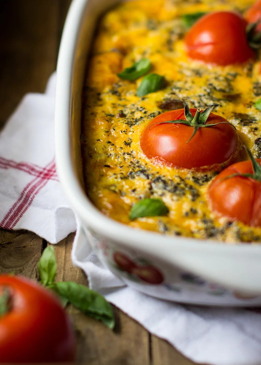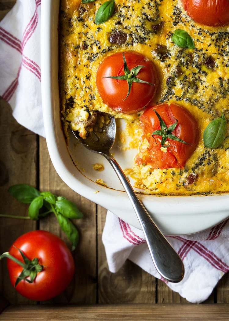 There's something about tomatoes on the vine that stop you in your tracks. While you probably aren't going to want to eat the actual vine, it definitely helps to elevate the look of a dish. And I love beautiful food - especially beautiful food that tastes good! So what a unique and beautiful way to dress up an already tasty, breakfast frittata.
